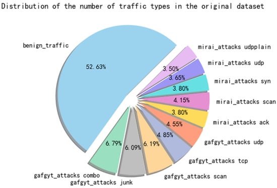 The N-BaIoT dataset comprises extracted functions derived from raw IoT network traffic information. Upon receipt of each packet, a synopsis of the protocol and the host’s behavior is computed with respect to the transmission of each packet. The contextual information of the data packet is then represented by a set of statistical features that are generated whenever a data packet arrives. Specifically, the arrival of each data packet leads to the extraction of 23 statistical features from five distinct time windows, namely, 100 ms, 500 ms, 1.5 s, 10 s, and 1 min. These five 23-dimensional vectors are subsequently concatenated into a single 115-dimensional vector.