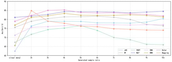 As shown in Figure 14, the utilization of the EM-FEDE method has improved the accuracy of various classification algorithms. This improvement was observed when expanding the dataset compared to the original dataset. Additionally, the optimal sample ratio for achieving the best performance varies across different classification algorithms. With an increase in the number of generated samples, the accuracy of each classification algorithm gradually increases. The accuracy of J48 has increased from 62.39% (x) to 80.43% (10x), RF has increased from 75.55% (x) to 81.73% (6x), PART has increased from 67.28% (x) to 76.49% (5x), MLP has increased from 81.09% (x) to 84.45% (10x), CNN has increased from 71.18% (x) to 77.05% (10x), KNN has increased from 76.8% (x) to 83.31% (4x), KStar has increased from 78.9% (x) to 85.24% (4x), and Bagging has increased from 65.5% (x) to 84.86% (2x).