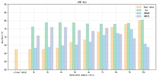 Based on the results presented in Figure 15, in our method, it is evident that the accuracy of the enhanced dataset, which includes a combination of fake data and real data at the generated sample ratios of nx (n = 2, 3, …, 10), is superior to that of an equivalent number of instances from the original dataset. At lower generated sample ratios, the mixed dataset exhibits significantly improved accuracy on J48 in comparison to an equivalent number of instances from the real dataset. As the generated sample ratio increases, the accuracy of the mixed dataset on J48 exhibits fluctuation, albeit within a small range, and ultimately reaches a plateau. Although the mixed dataset continues to outperform the real dataset in terms of accuracy on J48, its advantage diminishes as the generated sample ratio becomes larger.