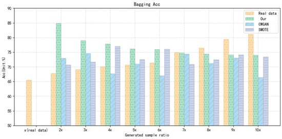 The results in Figure 16 show that the accuracy of the mixed dataset with generated sample ratio nx (n = 2, …, 6) on the Bagging algorithm is better than that of the corresponding number of real datasets in the method of this paper. However, for the generated sample ratio nx (n = 7, …, 10), the accuracy of the mixed dataset is lower than that of the corresponding number of real datasets. The experimental results reveal that the optimal generated sample rate for the Bagging algorithm using the method in this paper is 2x. Moreover, the accuracy of Bagging decreases and stabilizes as the generated sample rate increases.