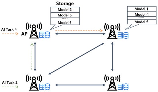 Denote the set of APs as . To clearly describe the connection relationship between different APs, we choose i and j as the indices of different APs, . In time slot t, AP i obtains M kinds of AI training tasks. According to the storage of AI model resources, tasks can be processed locally or in the corresponding AP j. For each AP, the task is denoted by . The set of AI models stored by AP j is denoted by . To ensure the successful execution of the task, AP j must store the AI model required by task m, which is , where is the type of task m.