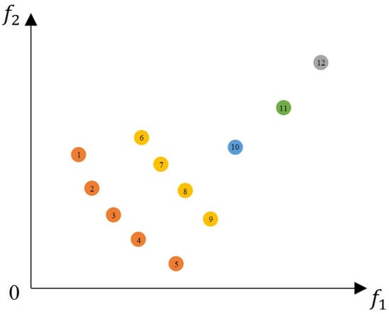 When an individual does not satisfy the constraints, a penalty value can be added to the objective function. The first layer is the set of non-dominated individuals in the population; the second layer is the set of non-dominated individuals obtained after removing individuals in the first layer, and so on. As shown in Figure 2, 12 individuals will be assigned to the corresponding fronts and individuals with the same color are at the same front. The details are shown in Algorithm 1. Each individual has two kinds of parameters: domination count and domination set . represents the number of individuals that dominate individual o, and represents the individual set dominated by individual o. First, the algorithm calculates and for each individual according to the dominance relationship and obtains the first non-dominated front . Specifically, if o dominates l, l will be added to the set of solutions dominated by o. Otherwise, the domination counter of o increases and o belongs to the first front. Then, for each individual in , the domination counters of its dominant solutions are subtracted by one. If the domination counter is 0, this domination will be added to . After multiple iterations, the individuals in are iteratively divided into different layers according to their rank. Eventually, sorted layers are obtained. The total complexity of finding all members of the different non-dominated levels in the population is , where K is the number of objectives. Hence, the worst-case complexity of fast non-dominated sorting is .