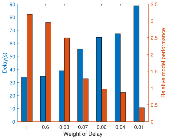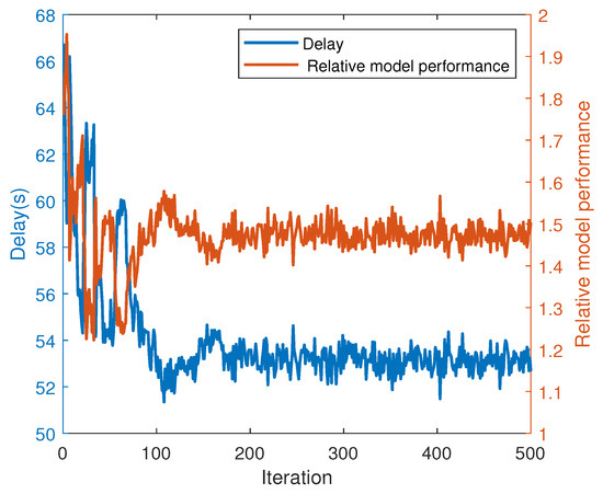 Figure 3 shows the performance of G-TSRA as the weight changes. is randomly distributed in . The algorithm converges around 250 iterations, and the delay and accuracy performances are obtained. The delay gradually increases as the weights decrease while the relative model performance decreases. This is because the weight belongs to the delay, so the weight reduction means that the delay’s importance is gradually reduced compared to the relative model performance. The algorithm will tend to optimize the relative model performance. The figure shows that the performance changes drastically when the weight value drops from 0.08 to 0.07, while the change between 1 and 0.6 is relatively stable. Therefore, the performance does not change continuously and smoothly with the weight value, so it is impossible to determine the required QoAIS by presetting the weight value before the algorithm is executed.
