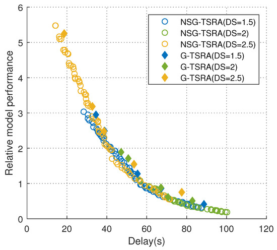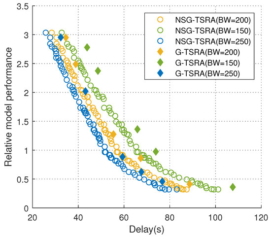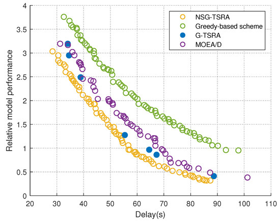 In Figure 5, we investigate the performances of G-TSRA, NSG-TSRA, the multi-objective evolutionary algorithm based on decomposition (MOEA/D) [29], and the greedy-based scheme. The greedy-based scheme selects the training node for the AI task based on the product of the computing performance of the node and the channel conditions from this node to all other nodes. Moreover, the maximum selection numbers are set for each training node, which can prevent a decline in performance due to the large number of tasks selected for the same node. Figure 5 shows that the performance of the Pareto solution of the NSG-TSRA-based scheme is better than that of the greedy-based scheme. The performances of G-TSRA and MOEA/D are slightly worse compared to NSG-TSRA.