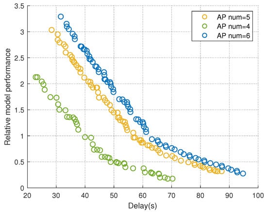 In Figure 8, we investigate the performances under different numbers of APs, which are 4, 5, and 6. The computing resources and channel conditions of APs are generated randomly, with the average AP computing resources and channel gain gradually decreasing. With the same relative model performance, the task completion time increases with the number of APs. The analysis is as follows: as the number of APs increases, the resources in the network increase. However, the number of requests also increases, and the decline in average resources caused by random generation in the simulation leads to a decrease in overall performance.