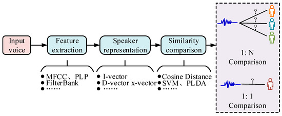 Figure 2 shows the flowchart of multi-method voiceprint recognition under the text-independent speaker recognition and text-dependent speaker verification systems. In practice, there is also often a scene and channel mismatch between the registration and test datasets, which is less effective for speaker recognition [18]. Therefore, for a speech recognition system, a detection cost function (DCF) is given as an evaluation metric using the expression shown in Equation (1).