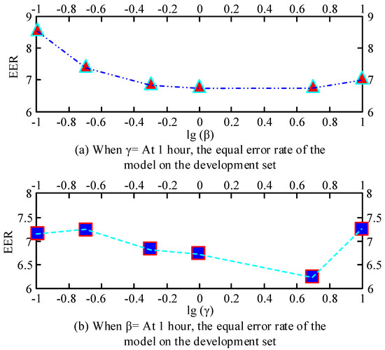 As can be seen from Figure 7, when the hyperparameter is set to 0, the EER indicator is 5.8, which presents the lowest value, and when the hyperparameter is 1.68, the EER indicator is 6.23, which is the highest value. However, when the hyperparameter is set to 0, the Top1 indicator is 76.69, which presents the highest value, and when the hyperparameter is 2.48, the Top1 indicator is 71.73, which is the lowest value. It can be seen that the lowest EER indicator and the highest Top1 indicator both appear when the hyperparameter is set to 0. In addition, two different loss function weights of the hyperparameters and were used to test the performance of the model, and the effects of the two hyperparameters on the EER are shown in Figure 8.