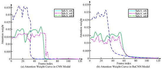 From Figure 9, where SpkA_utt2 and SpkA_utt3 are speech 2 and speech 3 of the exploring speaker, respectively, and SpkA_utt4 is speech 4 of the speaker for the distribution of attention weights when testing the speech. The horizontal coordinate is the frame index, and the vertical coordinate is the attention weight coefficient. The attention weight of SpkA_utt2 in the CNN model is highly similar to the corresponding SpkA_utt3, which can be large when the test speech is from a different speaker. The attention weight of SpkA_utt2 in the BaCNN model is 35 frames ahead of SpkA_utt4. The attention weights of the registered speech differ depending on the test speaker, which indicates that the representation of interactive speech from different speakers is indeed learned in the BaCNN model.