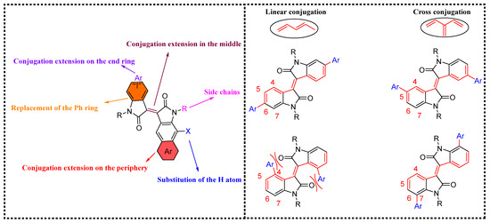 Regarding the substitution pattern on the phenyl ring, there are four positions available for introducing functional groups: the 4,4′, 5,5′, 6,6′, and 7,7′ positions (Figure 1 right). The 4,4′ substitution is restricted due to the unfavorable steric hindrance between the substituent and carbonyl group. The 6,6′ substitution results in linearly conjugated chromophores, while 5,5′ and 7,7′ generate cross-conjugated materials [16]. Broadly speaking, the substitution at the 6,6′ position results in the occurrence of conjugation throughout the entire molecule, allowing for more extended π-electron delocalization. Cross-conjugation is defined as the conjugation between two unsaturated π segments that, although not conjugated to each other, are conjugated to an intervening unsaturated segment. Playing with the linkage patterns is an important factor in molecular packing, which governs molecular topology and carrier transport. Materials based on the 6,6′ position have been intensively studied, while research into cross-conjugated materials has become increasingly important and urgent [16,17,18].