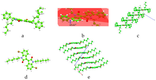 The single crystals of 4 and 7 were obtained via slow solvent evaporation from a solvent mixture of dichloromethane and methanol. The crystal structures of these compounds are shown below (Figure 2). The 7,7′ IID geometry obtained using X-ray diffraction showed a planar and trans configuration. The two lactam blocks were almost in the same plane, and the dihedral angle between the phenyl and the lactam plane was 65.61°. A similar phenomenon was observed for IID substituted at the 6,6′ position when the phenyl ring was used as a substituent, exhibiting a dihedral angle of 39.20° between the phenyl and the lactam [16]. Molecules 4 and 7 were stacked into a two-dimensional slipped π stacking with distances of 3.43 Å and 3.54 Å, respectively (Figures S1 and S2). The complexation energies of 4 and 7 were theoretically calculated to be 28.99 and 26.17 kcal/mole, respectively. The intermolecular interactions were strong and favorable for efficient charge transport [19]. The resulting structures reported in this paper have been deposited at the Cambridge Crystallographic Data Centre as a supplementary publication (CDCC 2278123−2278124).
