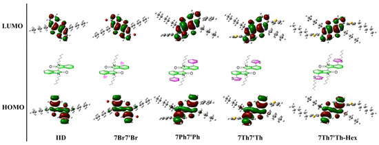 In attempt to gain insight into how cross-conjugation affects the optoelectronic properties of IID derivatives, their optimized molecular geometries, molar absorption coefficient (ε), highest occupied molecular orbital (HOMO) distribution, lowest occupied molecular orbital (LUMO), energy gap (ΔEc), and oscillator strength (fosc) were calculated using DFT at the B3LYP/6-311 (d, p) level basis [20,21] set of the Gaussian 16 program in order to obtain a low-energy conformation [22,23]. To compare the effects of alkyl chains on the thiophene ring, all long hexyl alkyl chains were retained during the calculations. Figure 3 displays the LUMO and HOMO distributions. It can be clearly observed that the LUMO was mainly distributed on IID units, while the HOMO was delocalized along the backbone. The detailed data of the frontier molecular orbital energies, ε, and fosc are shown in Table 1. For the sake of comparison, the results of the DFT calculations with respect to the introduction of phenyl and thienyl at positions 5, 6, and 7—corresponding to reference numbers 5Ph5′Ph, 5Th5′Th, 6Ph6′Ph, 6Th6′Th, 6Ph7′Th, and 6Th7′Ph, respectively—are also listed in Table 1. The material with the introduction of halogen atoms, 7Br7′Br, exhibited a deep-lying LUMO energy level and a slight red shift in its maximum absorption bands compared with the IID. The LUMO energy levels of materials based on the IID analogs were determined using electron-absorbing groups, which were all around –3.05 eV for this family of materials. Nevertheless, the HOMO energy levels of the materials in this series were altered accordingly. The introduction of different substituents at the 7,7′ position induced a change in the HOMO’s energy levels, which were more pronounced when comparing the energy levels of 6Ph6′Ph with 6Th6′Th or 5Ph5′Ph with 5Th5′Th and roughly exceeded 0.1 eV. In fact, the introduction of the –Ph unit with the –Th unit on each side of the IID (6Ph7′Th vs. 6Th7′Ph) resulted in a completely different HOMO energy level. On the other hand, a comparison of 6Ph6′Ph with 5Ph5′Ph showed that both exhibited similar HOMO energy levels, suggesting that the change in the conjugation pattern induced by varying the position of the substituent did not lead to a substantial change in HOMO energy levels. The ε and fosc of cross-conjugated materials were within the regions of 10,000 and 0.1, respectively, whereas the ε and fosc of the linearly conjugated IID were far greater than those of the cross-conjugated material, approaching 30,000 and 0.5, respectively. The different positions of the electron-donating groups did not induce a strong effect on HOMO energy levels, which were more sensitive to changes in the substituent types. There was a pronounced correlation between the different conjugation modes and the absorption coefficient and oscillator strengths of the materials.