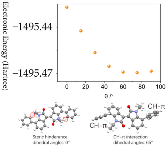 The theoretical calculation of the torsion angle agreed with the crystallographic results of 7 (Figure 4). When the phenyl ring was presented as a substituent in 7, the lowest energy was observed at dihedral angles of 60° to 80°, which was mainly related to the C–H···π interaction forces present within the molecule. The interatomic distance of C–H···π was calculated to be 2.96 Å. If the dihedral angle approached 0°, the C–H on the alkyl chain was hindered by the intermolecular space due to its proximity to the C–H of the aromatic moiety, resulting in elevated energy and instability.