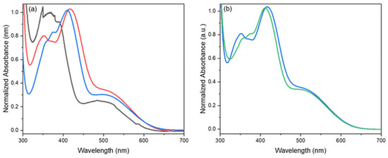 (a) UV–Vis spectra of IID (black), 8 (red), and 7 (blue); (b) 9 (blue) and 8 (green).