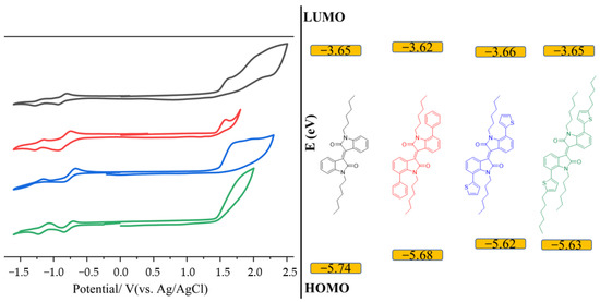 Cyclic voltammograms (left) and energy band diagram (right) of IID derivatives: IID (black), 7Ph7′Ph (red), 7Th7′Th (blue), and 7Th7′Th-Hex (green) in dichloromethane.