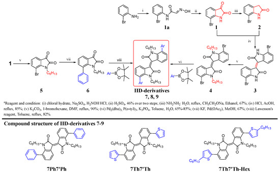 Synthesis of IID derivatives 7–9: 7Ph7′Ph, 7Th7′Th, and 7Th7′Th-Hex.