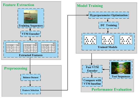 Figure 4 depicts the training and implementation process of the decision tree classifier within the VTM encoder, as illustrated in the framework. After feature extraction, it is used for classifier training. The VTM encoder was modified to collect multiple statistics containing information related to CU partitioning decisions. This process generates a dataset specific to each partition type. The dataset comprises encoder properties, video encoding sequences, and relevant features for partitioning decisions. In the preprocessing step, the dataset is first balanced and then key features are selected. These selected features serve as the input for training the classifiers. The training process of the model consists of the hyperparameter optimization and separate training of the classifier. Finally, the improved VTM encoder is evaluated for encoding time and efficiency savings. The encoder incorporates a decision tree classifier for QTMT partition determination but does not perform a full RDO process.
