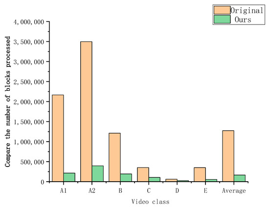 In addition to the ΔT and BDBR comparisons discussed earlier, we also performed a comparative analysis of the number of CU partition blocks. Specifically, we calculated the average number of RDO blocks per frame for each of the four quantization parameters (QP) {22, 27, 32, 37}. By conducting experiments, the effectiveness of our method was successfully verified. Figure 6 displays a comparison of the number of blocks after processing. It can be seen that our method processes only 20.71% of the blocks with the original RDO settings, which proves the effectiveness of our algorithm. In particular, for high-resolution video sequences (A1 and A2), our method achieves a significant reduction in the number of encoded blocks by 90.14% and 88.72%, further illustrating the superior performance of our method for high-resolution video sequences. We can also verify the effectiveness of our method through many papers [36,37,38,39,40].