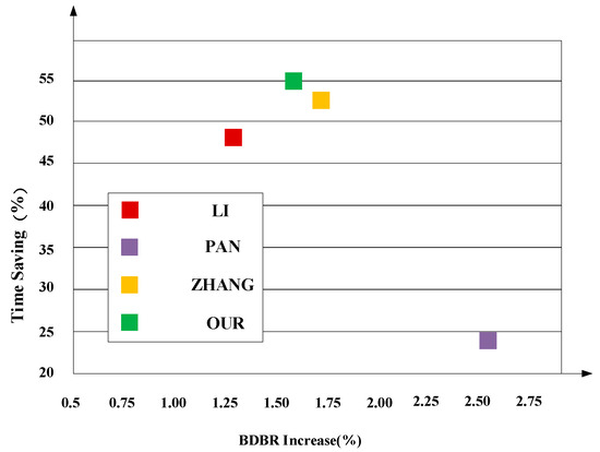 Figure 7 demonstrates that our solution outperforms the three algorithms in [33,34,35], achieving a favorable balance between BDBR and ΔT.