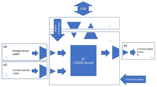 The proposal considers embedding the digital controller with the input and output signals into the same board to achieve an integrated platform that allows the rapid implementation of real-time control algorithms into physical systems that involves electrical signals. Figure 1 shows the scheme for the platform, which presents isolated measurements for three voltage and three currents, five isolated two-channel digital outputs, and as the core for the platform, a microcontroller from the family C2000. The description for these elements is below.