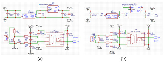The electrical sensors are based on resistive elements to obtain a reduced voltage for the voltage and current measurements. The voltage sensor considers exploiting a resistor divider. In contrast, the current sensor uses a shunt resistor, which aims to map the input voltage and current signals to low voltage measures in the range of ±250 mV for posterior signal processing. The voltage and current sensors allowed measurements of ±300 V and ±15 A, respectively. The isolated sensors implement an optical barrier isolation amplifier to generate a differential output voltage based on the input voltage measurement. The low-voltage measurement is moved to the control system by an optically based isolation amplifier, which takes the differential input from the sensors and generates a differential output voltage by applying a fixed gain. The use of differential signals reduces the common mode noise in the measurements. The circuit requires an adequately isolated and regulated power supply; hence, a DC-DC isolated converter is used with a voltage regulator. The circuits for the voltage and current sensors are shown in Figure 2.