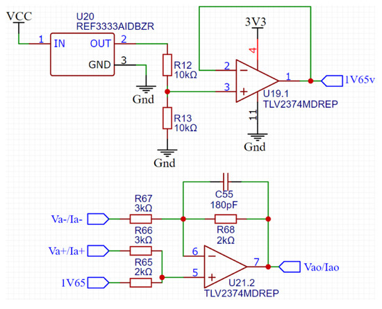 The microcontrollers for this platform use 12-bit single-ended analog-to-digital converters (ADC); hence, the differential output for the isolation amplifier needs conditioning. Figure 3 shows an operational amplifier circuit that creates a single signal with an offset voltage corresponding to half of the voltage reference for the ADC conversion (1.65 V).