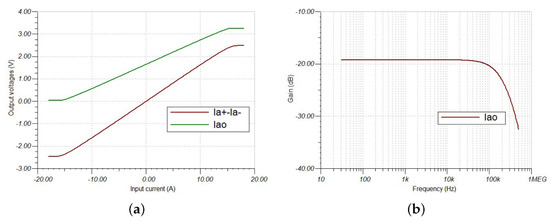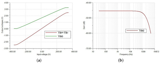 The DC sweep considers a DC input voltage from −350 V to 350 V to obtain the output voltage, which presents a linear response in the range from −300 V to 300 V. The bandwidth is the same for the current sensor due to the same conditioning elements.