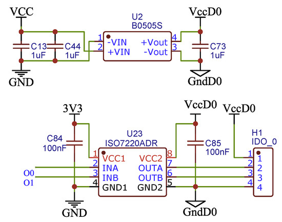 The outputs for the platform are isolated digital electrical signals with its power supply. The outputs implement two-channel semiconductor-based isolation barrier digital isolators. These devices need a floating power supply to work on the secondary side to achieve adequate isolation; hence, the isolated output supply implements single-chip isolated DC-DC converters, the same for the measurement stage. The circuit proposed to obtain the single digital output is presented in Figure 6. Thus, each one of the five platform outputs has two channels with its floating power supply. The digital outputs for each channel work on 0 and 5 V levels for the logical values of 0 and 1, respectively. The digital output signal is also delayed 400 ns from the microcontroller pin output due to the digital isolator.
