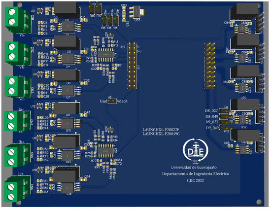 The board for the real-time control platform is in Figure 8, where on the left are the voltage and current sensors, while at the right are the digital output signals.