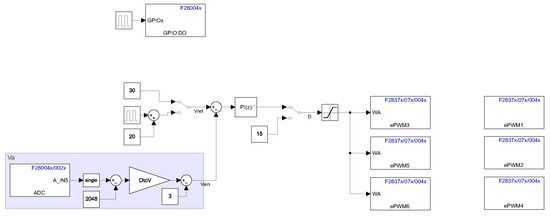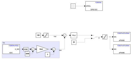 The control involves managing the three power transistors , , by PWM, and the close-loop operation requires the output voltage measurement to implement the control law; thus, three digital outputs control the transistors, and one input voltage measures the output signal. The Simulink control implementation is shown in Figure 12, which considers the block diagram of a proportional integral (PI) controller described by