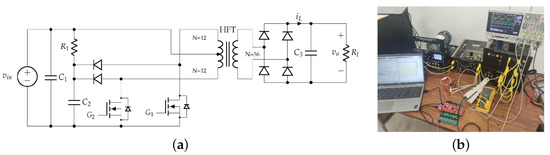 The second test considers the push–pull converter, an isolated DC-DC converter. Figure 17a,b present the scheme and experimental implementation for the topology, respectively.