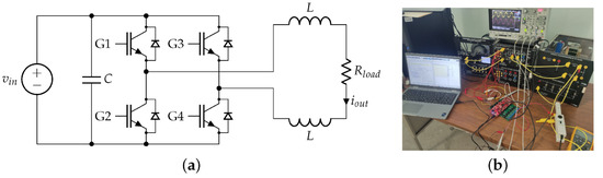 This test involves the use of an H-bridge power electronics topology to the current control of an AC load. Figure 22a,b show the schematic diagram and experimental setup, respectively.