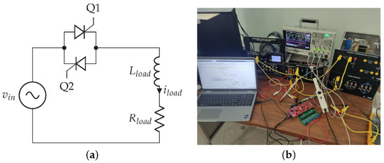 The fourth test implements the control for the thyristor-based AC-load controller, involving the input voltage measurement, managing the thyristors and , and the realization of the phase-detection algorithm. Figure 26a,b show the scheme for the topology and the practical implementation for this case study.
