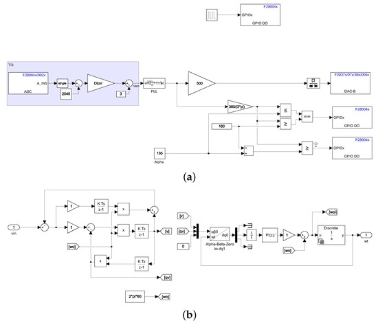 The control for the thyristors requires the input voltage phase comparison with a reference angle . Figure 27a presents the Simulink control for this topology. The phase-detection implements a phase-locked loop (PLL) with DC offset rejection [25], which is implemented by the circuit shown in Figure 27b.
