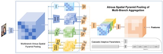 Existing network structure design methods, such as cascading [,,], pruning [,], and weighted summation [], are available. Among them, only cascading is utilized in ASPP and does not use weighted summation. Therefore, this study proposes a weighting method called cascaded adaptive parameters (CAPs), for which atrous spatial pyramid pooling of multi-branch aggregation, MBA-ASPP, is one.