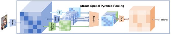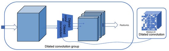 where for represents the dilation factor. The atrous convolutional group is represented by Equation (2). For brevity, the above equation does not declare normalization, activation functions, or other operations, so they are added here. Equation (2) is followed by BatchNorm batch normalization and the Relu activation function.