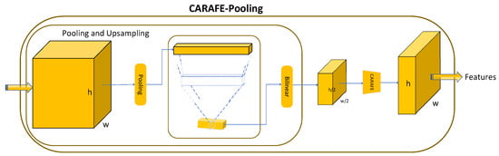 ASPP’s pooling layer is formed by bilinear interpolation to upsample operation and bring the feature map back to its original resolution, but the bilinear interpolation [] guides the upsampling by the sub-spatial distance of the pixels and does not have learnability. Therefore, this study uses the CARAFE operator [] to assist bilinear interpolation to complete the upsampling operation. Specifically, on top of the pooling layer, the feature map is restored to half the original resolution using bilinear interpolation, and then the feature map is restored to its original resolution using the CARAFE operator to make it learnable, this is called CARAFE pooling. One of the CARAFE operators [] is a lightweight upsampling operation, which has a lower computational complexity compared to upsampling operations such as STN [] and DCN [].
