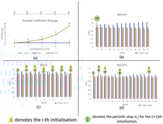 (a) shows the change in the periodic step of the diagram of CPAs using the periodic coefficient strategy; (b–d) show the variation plots of the CPAs using the periodic coefficient strategy of , , and , respectively. inf denotes .