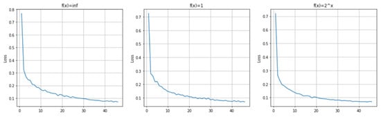 Inspired by Cyclical Learning Rates (CLRs) [], during network training, the model inevitably falls into local minima or saddle points several times, and the use of these CLRs (learning rates varying between maximum and minimum values) helps the model to move out of local minima or saddle points faster. This study uses Equation (6), which periodically adjusts the weight ratio of each branch (the weight ratio is initialized to 1 for each branch), to help the model move out of local minima or saddle points due to chance uncertainty. However, adjusting the weight ratio of each branch may cause the model to jump from one critical point to another (local minima or saddle points). Therefore, the main idea of this study is to periodically adjust the weight ratio of each branch using Equation (6). This is done to maintain a large learning rate at all times, so that if the model is at a local minimum or saddle point for a long time due to chance uncertainty but is unable to move away (or if the model is not at a critical point), the model will move away from that critical point (or out of that position) when the periodic function takes effect. The model may experience three situations: 1, not immediately falling into the next critical point; 2, falling into the next critical point, relying on a larger learning rate to disengage; and 3, falling into the next critical point, not relying on a larger learning rate to disengage and waiting for periodic adjustment of each branch weight ratio. To maintain a large learning rate at all times, this study uses the learning rate strategy polylr. The learning rate (lr) is set to 60 k by the formula , while the maximum number of iterations, iter, is only 30 k and the power is set to 0.9 so that the decay rate of the learning rate (lr) is small and the minimum value is half of the initially set learning rate. The optimizer in this study uses Stochastic Gradient Descent (SGD), a method for finding optimal parameter configurations for machine learning algorithms. As shown in Figure 7, the graphs of have the fastest convergence in terms of the loss (compared to the CLR, which acts directly on the learning rate, which is not significant), and the periodic coefficient strategy (PCS) has a domain of only n parameters.
