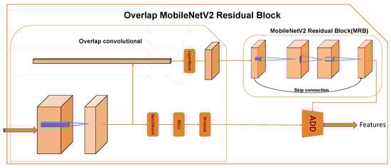 Considering that MBA-ASPP uses CAPs to induce the model to automatically suppress or promote the weight ratio of each branch without changing its feature dimension, the output of the model must be compressed in the feature dimension. In the field of image segmentation, a convolutional kernel of 1 × 1 is generally used with a convolutional compression dimension, resulting in a certain loss of features. The use of linear transformations offsets the shortcomings of a convolutional kernel of 1 × 1, but SPPNet [] uses multiple pooling layers stitched together to obtain a very long sequence vector, which will undoubtedly increase the difficulty of model training. Therefore, this study introduces MRB [,], and thus proposes Overlap MobileNetV2 Residual Blocks (OMRBs). Overlap convolution and MRB [] are employed to construct an approach of vertical and horizontal modeling. As shown in Figure 8, this process is as follows:
