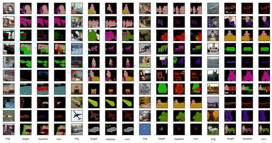 As shown in Figure 9, Deeplabv3plus-MBA exhibited a significant performance on the PASCAL VOC 2012 dataset, using Deeplabv3plus [] as the baseline. The PASCAL VOC 2012 dataset is a multi-category dataset and has significant improvements over the PASCAL VOC 2012 dataset, validating the side accuracy of this study.