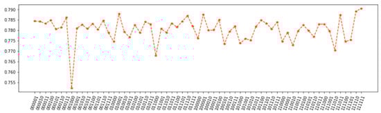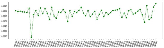 - It is more stable. Training a neural network by randomly sampling the data will cause data fluctuations. This is due to SGD, which can lead the model into a local minimum or saddle point, so data fluctuations often exist in the neural network training phase. As shown in Figure 13, the MPA (Mean Pixel Accuracy) box plots of data fluctuations found with have the smallest range of data fluctuations and the best means. In Figure 14, the FWIoU (Frequency-Weighted Intersection over Union) box plots of data fluctuations found with have the best means and the fewest outliers. In Figure 15, the MIoU (Intersection over Union) data fluctuation plot found with have the least number of blank spaces in the Savitzky–Golay fit line (adjacent [max, mean] or [min, mean] are not adjacent to each other, the Savitzky–Golay fits to large blank areas between the maximum and minimum). However, it can be concluded from the experimental data in Table 6 that the periodicity coefficient strategy outperforms the others. Using the average value as the evaluation criterion, the periodicity coefficient strategy ()’s MPA, FWIoU, and MIoU are 88.481%, 90.333%, and 79.071%, respectively, while the periodicity coefficient strategy ()’s MPA, FWIoU, and MIoU are 87.958%, 90.240%, and 78.785%, respectively. The periodicity coefficient strategy () has a greater MPA, FWIoU, and MIoU than the periodicity coefficient strategy ().