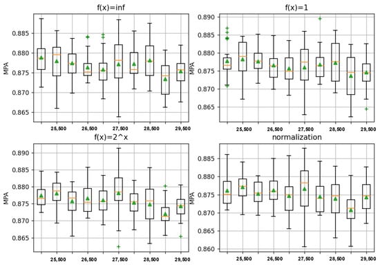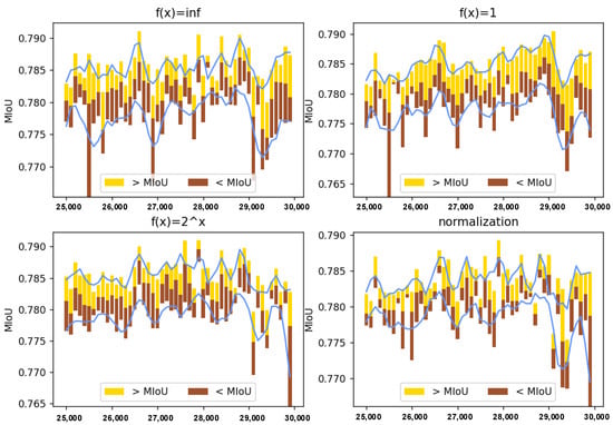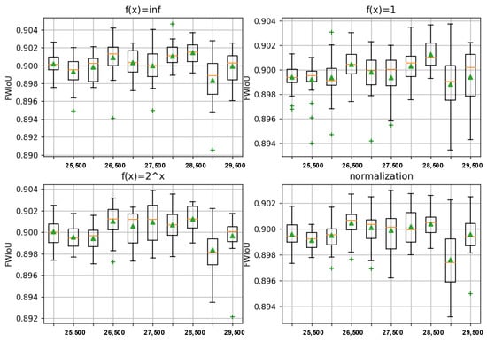 As shown in Figure 13, Figure 14 and Figure 15, CAPs and the periodic coefficients strategy or normalized weights were used for several experiments to validate the MPA, FWIoU, and MIoU, respectively. In Figure 13 and Figure 14, data fluctuations in MPA and FWIoU have been studied using box plots, with green triangles representing means and green ‘+’ symbols representing outliers. In Figure 15, the real situation of MIoU is validated by taking the iteration interval [25,000: 30,000] and taking the average, [maximum, mean], and [minimum, mean] for the same iteration to highlight the data fluctuations during the training period. The maximum and minimum values were also smoothed and fitted using the Savitzky–Golay smoothing filter.