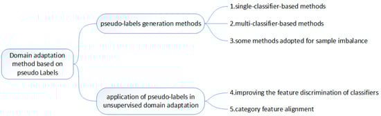 The primary emphasis of this review is to analyze the methods for generating pseudo-labels and their applications in unsupervised DA. First, the generation methods are categorized as either single-classifier-based or multi-classifier-based, and the measures for dealing with sample imbalance are explored. Second, the paper examines the applications of pseudo-labels in unsupervised DA, which are divided into two parts: using pseudo-labels for category feature alignment and for enhancing the feature discrimination of classifiers.