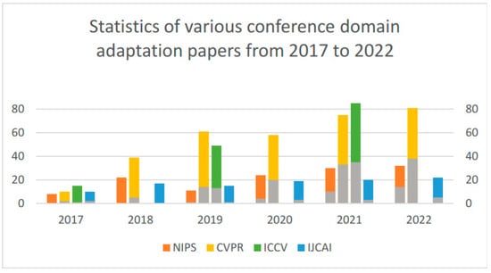 We investigated the papers in some top sessions from 2017 to 2022 and counted and analyzed the number of DA papers on pseudo-labeling methods, as shown in Figure 1. Overall, the number of DA-related papers grows year by year, and it is expected that more and more research on DA will be conducted in the coming years. We use darker colors to represent papers on DA that utilize pseudo-labeling methods, and it is evident that the quantity of these papers has been growing steadily over the years. It is worth noting that its share in the overall DA papers is also increasing year by year; in particular, nearly 50% of the DA papers in the ICCV and CVPR conferences in 2022 used pseudo-labeling methods, which indicates the successful application of pseudo-labels in DA.