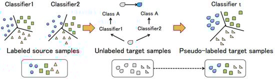 The basic assumption of the single-classifier-based generation approach is that the model’s own highly confident predictions are correct [15]. The single-classifier-based approach generates pseudo-labels by using the model’s own confident predictions for unlabeled data. In semi-supervised classification tasks, it can predict unlabeled data by using a limited quantity of available labeled data, filtering according to some criterion, and finally training the model together with true labels and pseudo-labels [12,16]. In contrast, in unsupervised DA problems, using a model trained from labeled data and pseudo-labeling the unlabeled data can be of great help in promoting domain alignment, especially category-level alignment.