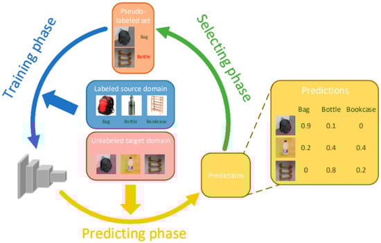 In addition to this, the authors use triplet loss to facilitate category-level alignment. Samples are randomly selected on the basis of the sampling approach. The pseudo-labels for the are obtained by maximizing the posterior probability of the cross-entropy, which is gradually optimized as the model is trained. In addition, based on the intuitive consideration that images with high prediction scores are more likely to be correctly classified, only samples with prediction scores above a certain threshold, T, are chosen for training in this paper, and the threshold is set as a constant in this paper. To avoid mislabeled target instances from propagating errors to the next iteration to disrupt the subspace learning process, Tanwani et al. [55] employ a network trained on data in the initial stages of training to predict pseudo-labels for unlabeled and, then, retain only the most confident pseudo-labels for each category, resulting in a balanced mini-batch consisting of equal numbers of and data for replacement sampling during training.