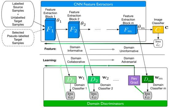 Zhao et al. [37] integrated a DANN with a teacher–student network model [38] to learn feature representations with target differentiation using a consistency-forcing approach. It used prediction averaging and label sharpening to generate pseudo-labels for unlabeled and introduced interpolation consistency into the unsupervised DA task to enhance the clarity of the decision boundaries. Zhang et al. [39] divided a CNN feature extractor into several blocks, each block being a set of CNN layers, as shown in Figure 8.