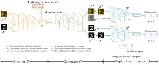 Yang et al. [46] proposed a bidirectional generation cross-domain generation framework by adding MMD loss and consistency loss to the loss function and pseudo-labeling the data using the classifier obtained from pretraining to implement a bidirectional cross-domain generation method. Hu et al. [47] preserved the category structure of the by a duplex discriminator that also included classification tasks while aligning the overall features of the domain, as shown in Figure 9.