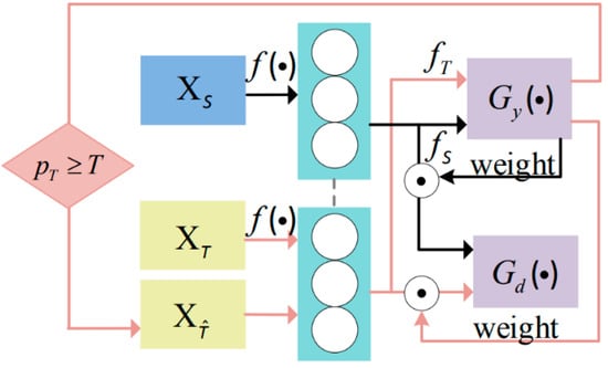 To alleviate the above problems, more and more adversarial-based DA methods have started to consider category-level alignment, where the combination of adversarial training and pseudo-labeling methods is notable. Based on DANN, Zhang et al. [52] introduced center loss to achieve conditional distribution alignment. They proposed a method to deal with unlabeled samples in the . They used the predictions of the classifier to allocate pseudo-labels to each sample and defined the loss function as shown in Equation (10).