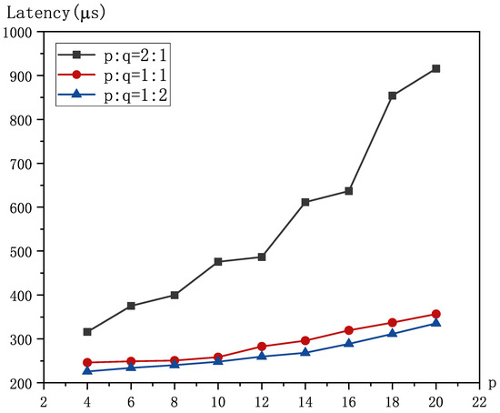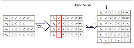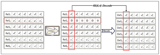 - Decoding segments. Based on the received m segments and constructed segments with L zero bytes, matrix is constructed and the first group of p segments can be decoded according to Equation (3). Decoding matrix can be obtained by decoding , which is called a decoded result, and each row of can be considered as a decoded segment.